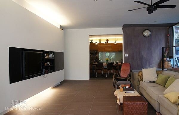 再往裡頭走是具時尚感的客廳區,素面沙發組、面對著極簡約的多功能電視櫃,由這個位置向大門口望去,可以感受到整個空間絕佳的明亮度與通透感。「由於大門口偌大的落地窗、加上雙門設計,不但採光效果佳且通風性好,夏天只要大門全開,加上吊扇,室內就可以感受舒爽涼快的徐徐微風、不用冷氣,符合環保概念!」
