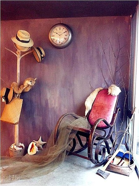 也難怪,當一踏入一樓室內,感受到的是與戶外相同的大自然氣息。此外,包括牆角或端景,也處處見到巧思,例如:樹枝DIY製成的衣帽架、玄關櫃上椰子殼猶如獨木舟滿載著花朵、高腳椅搭配木覘板的盆栽座等,不得不佩服黃老師的創意巧思。