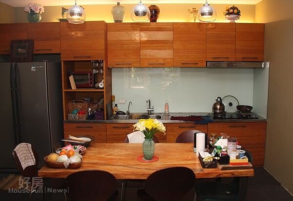 廚房佈置時尚典雅,採用大量的檜木作為主體,有一種溫潤的親切感