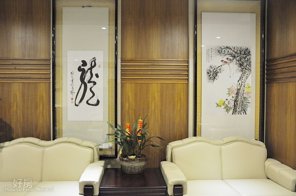 客廳牆上擺設水墨字畫,搭配桌上盆栽相當雅致