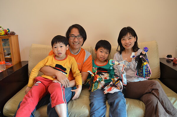 走進他們的家,挑高四米五的客廳相當寬敞,牆上掛著三幅從西藏帶回來的唐卡,電視機旁邊還有布袋戲玩偶的收藏,最特別的是上頭的歐式小陽台成了孩子們的布袋戲表演台。