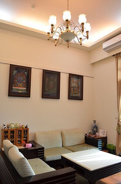 ↓挑高四米五的客廳非常寬敞,牆上是從西藏帶回來的唐卡