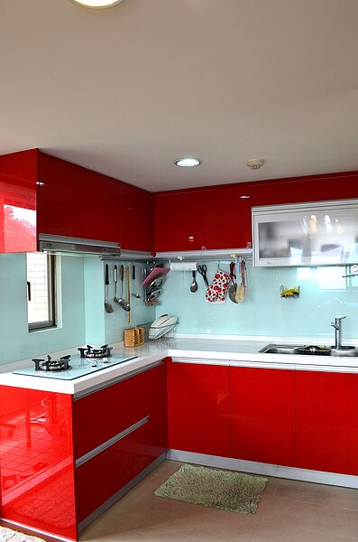 ↓紅色的系統廚櫃讓用餐氣氛也開心起來