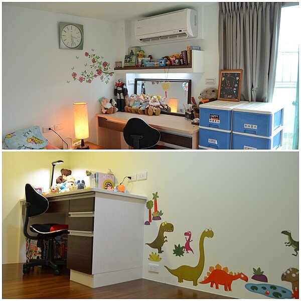 客廳的旁邊規劃了孝親房,Amy說:「體恤公婆年紀大了,爬樓梯不方便,所以在樓下規劃了他們的房間。」兩間兒童房則分別在樓上與樓下,牆上的壁貼都是兒子們自己挑選貼上的,看得出兩人的個性截然不同:老大斯文,貼的是花草;老二活潑,貼的是恐龍!老二的房間還兼做遊戲間,裡面放了很多小朋友喜歡的玩具。