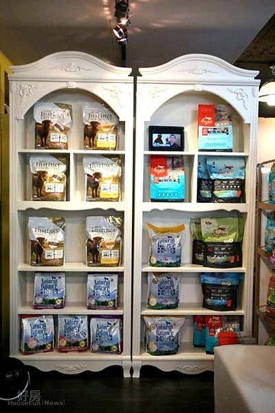 走進店內,一邊是有著紅色格子的層架,擺放著貓砂產品,另一邊則是白色古典櫃,陳列著零嘴、飼料,而中間的白色矮櫃則放置了許多的罐頭,旁邊還規劃了「狗狗安親區」,可幫忙代顧狗狗。最特別的是,店內的一角設置了咖啡區,這是趙婷與老公體貼顧客的心意,「我們希望來店內的顧客,可以來這裡喝咖啡、交朋友,當作是可以放鬆的休閒空間。」