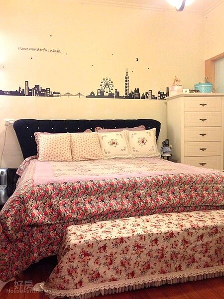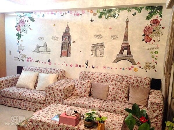 原本黑色的沙發換上碎花布,搭配壁貼好浪漫