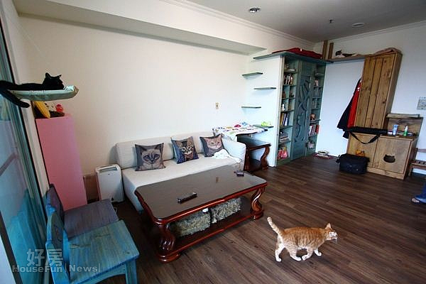 ↓客廳隨處可見貓咪的蹤影,傢俱上也融入體貼貓咪的設計