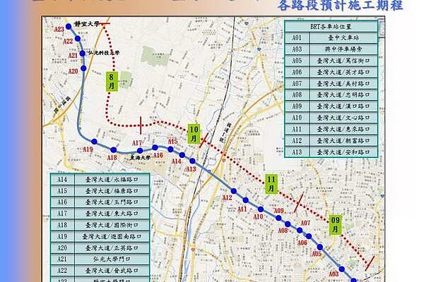 台灣大道靜宜大學至東海大學路段車站圍籬均已架設完成,進行BRT站體基礎及鋼構工程中,相關工程將向市區邁進,除了中正路段進行BRT行控中心裝修施工,安和路至玉門路段也開始架設圍籬。