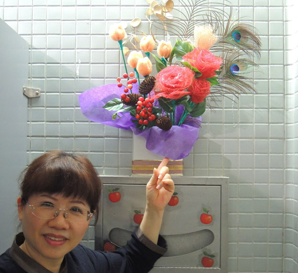 另位於展場1樓女性洗手間第6間的作品是「花團錦簇」,映入眼簾的是一束美不勝收的花束。創作者導覽人員鄒小姐表示,創作的靈感是來跟同事的閒聊,讓她決定打造出繽紛亮麗的環境。而材料全都來自於平常博物館體驗活動剩餘的素材,利用一般人想不到的菜瓜布,做出漂亮的鬱金香及玫瑰,既符合主題又環保。