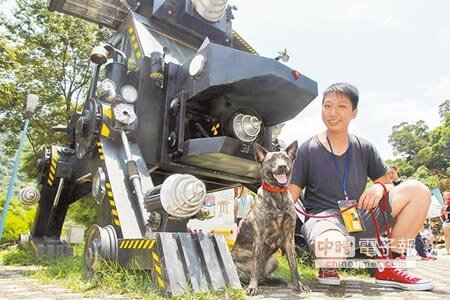 宜蘭綠色博覽會邀8名年輕當代藝術家,以新視野探討雪隧開通前後造成的利與弊,其中1件揹負鑽頭的黑色機械狗《好運二號TBM》,將流浪狗議題與雪隧TBM概念結合,成遊客拍照熱點。(簡榮輝攝)