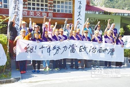 「怒!十年努力當政治酬庸。」奇美部落族人齊聚文物館前拉白布條抗議,並撤走屬於奇美部落文化發展協會產權的珍貴資產,強調部分將重新佈展於部落內其他建物裡,部分則送台灣史前文化博物館整理與維護。