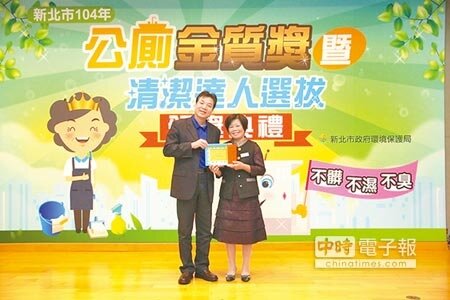 新北市府環保局昨天頒獎表揚「公廁金質獎暨清潔達人」,獲獎公廁乾淨雅緻,幾乎到了一塵不染,幕後最大功臣的清潔達人,舉凡便器內外部到鏡面的水痕,更是通通都不放過。
