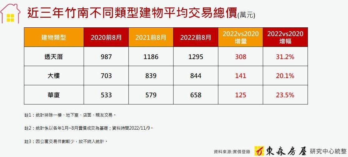 東森房屋研究中心彙整實價登錄資料發現,近兩年竹南各類型住宅的平均成交總價均呈現不同程度的驚人漲幅,其中以透天厝的漲幅最快,目前竹南透天的平均成交總價約為1295萬元,與2020年同期的987萬元相比,兩年激增308萬,成長幅度超過三成,大樓、華廈的平均總價漲幅也在兩成以上。對此,東森房屋研究中心葉沛堯經理指出,竹南生活機能完備,房價基期相對較低,又有建設題材、科技題材、人口紅利作為支撐,區域發展前景相當看好,有意在竹南置產的民眾不妨把握時機、早做準備。