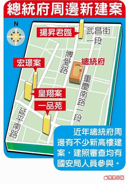總統府後方將蓋逾20樓高建案,恐又出現維安問題。日月光集團旗下宏璟建設將於總統府後方、延平南路蓋逾20樓住宅,因鄰近博愛特區,建築規劃再度受到限制,不僅樓高從107公尺降為70多公尺,10樓以上住戶面總統府那側,窗戶不得開啟。