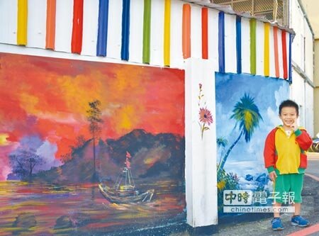 八德市興豐路869巷內圍牆近來彩繪塗鴉,一旁的埤塘也清理乾淨,住附近的孩童看到圍牆的繪畫及乾淨的埤塘,開心不已。