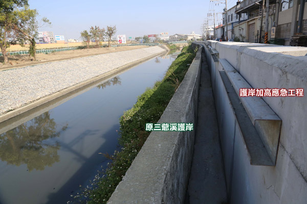 為解決大台南仁德及大灣地區水患問題,市府水利局於102年完成三爺溪仁德滯洪池以南各支流護岸加高應急工程,今年將接續再完成三爺溪主流上游段及仁德滯洪池以北各支流護岸加高應急工程,賴清德日前前往三爺溪左岸現場勘察治水工程進度,希望在各項工程完成後,能大幅改善三爺溪左岸淹水情形。
