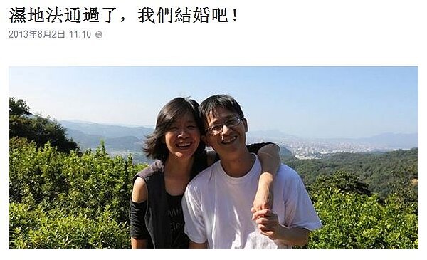 台灣蠻野心足生態協會秘書長林子凌和環境律師詹順貴,是有名的社運情侶檔,今天在新北市新店戶政事務所完成結婚登記手續,正式升格為夫妻檔,詹順貴選擇在臉書上公布喜訊,寫下「律師和流氓婆」的感謝,表示「謝謝大家的祝福,也希望大家一起為捍衛台灣這塊土地繼續奮鬥」。