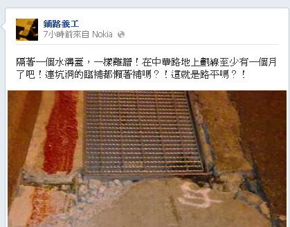 日前《ETtoday新聞雲》曾報導,「北市110億路平專案路不平 鋪路姐深夜自費補路坑」,有位李姓粉領族,因受不了上班通勤路線的道路品質,而自費在假日深夜幫忙補破洞。沒想到消息傳開後,工務局人員不但不領情,還幹譙鋪路姐「害死人」。