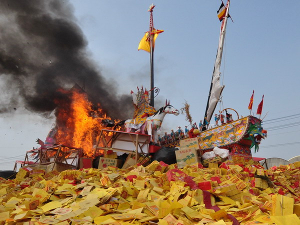 王船在沿途中撒出金紙,像天女散發般,甚是壯觀,沒多久就到2公里外的王船地。王船於10時許起火,一時之間,鑼鼓喧天,象徵地方運數的王船主桅杆於11時30分許倒向南方,歷時數月的香醮於下午時分謝燈篙後宣告落幕。