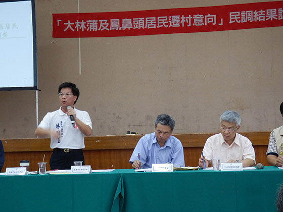 高市府於100年7月28日函送大林蒲遷村民調報告予行政院及相關部會,專業民調公司所辦理的遷村調查中,高達71.4%受訪者表示贊成遷村。應經建會要求,市府亦於101年3月29日再度函送「大林蒲六里暨林園汕尾四里遷村分析報告」供行政院參考,然遲未獲回應。