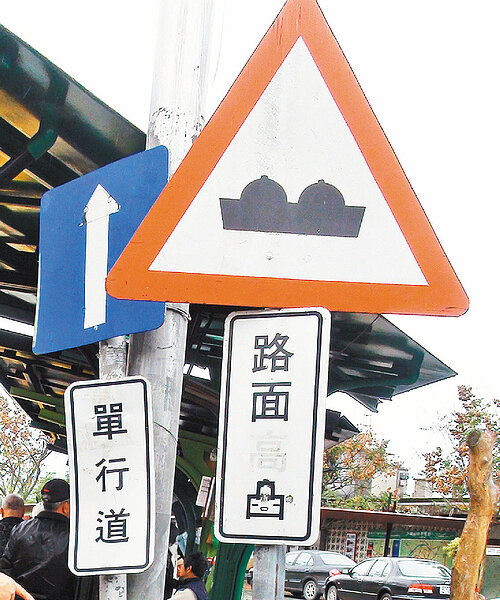 「路面顛簸變『雙峰激凸』了!」宜蘭火車站前的交通標誌被惡搞,路面凸起的圖案被人多加了兩個小點,有旅客害羞,有人覺得好笑。警方說,擅自變更標誌可開罰,縣府則說要換。