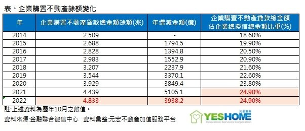根據金融聯徵信中心的企業跟銀行貸款用途資料顯示,近年企業購買房地產的貸款餘額快速走高,到去年10月前,累積買不動產的餘額已高達4.833兆元,是有統計來新高,而且近1年就增加了3938.2億元,為統計以來同期第2高,僅次於2021年的年增5105.1億元。
