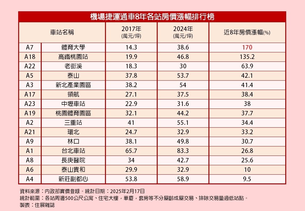 軌道經濟再度帶動周邊房市發展。3月將至,迎來桃園機場捷運通車的第8年,根據內政部實價登錄,該路線各站相比8年前,如今已全數出現漲幅,尤其在A7體育大學站及A18高鐵桃園站,2站周邊房價更是翻倍上漲。