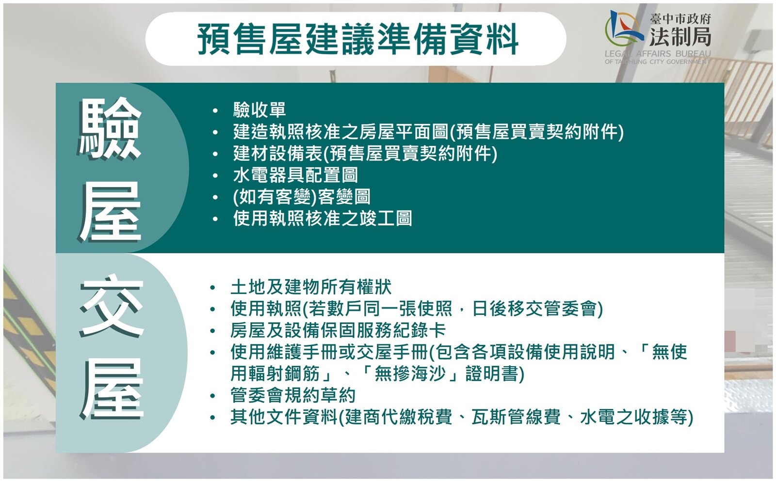 台中市政府法制局提醒,由於預售屋興建期程需要一段時間,到驗屋、交屋時,購屋民眾才能目睹未來新家實況,因此消費者於交屋前,一定要先驗屋,並記得向建商索取驗收單、房屋平面圖、建材設備表及水電器具配置圖等圖說文件,才能據以核對預售屋是否具備契約約定的品質,保障自身權益。