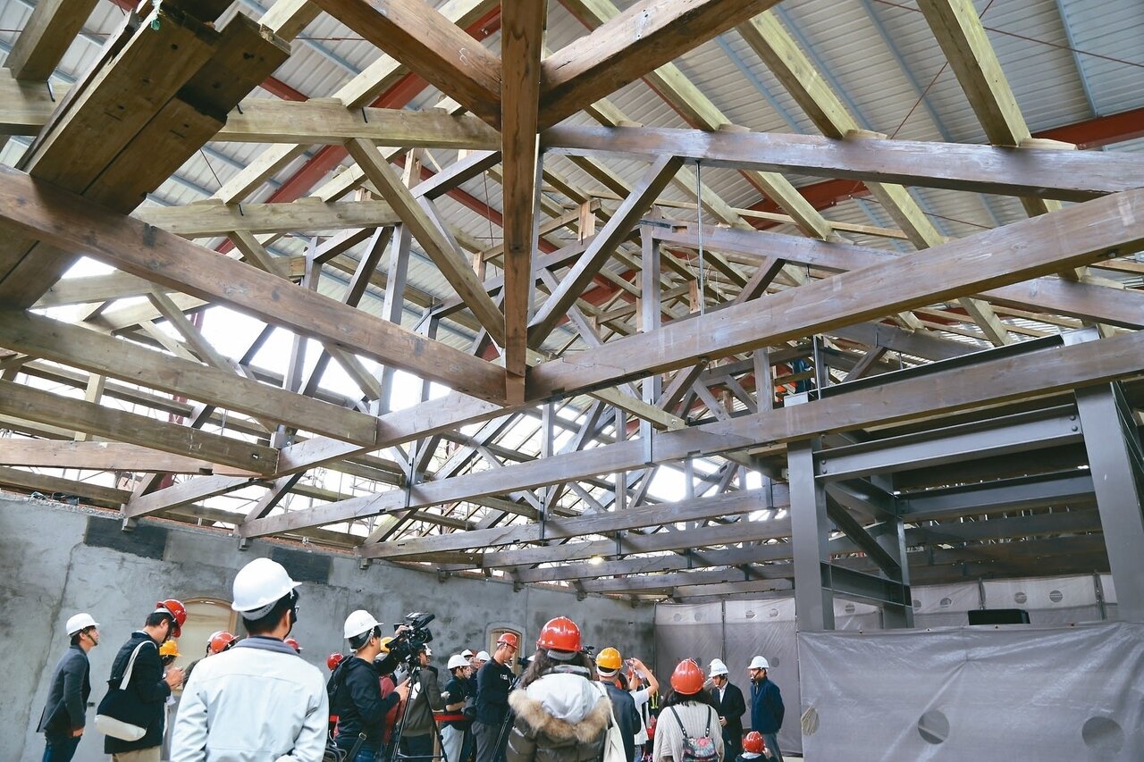 北市歷史建築三井倉庫重組保存工程昨舉行上梁典禮,預計8月開放,將是全台第一座隔震文資建築。 (記者魏莨伊/攝影)
