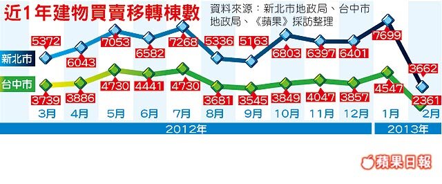 新北市、台中市及高雄市昨公布2月份建物買賣移轉棟數,均較1月大減超過4成,新北市為3662棟,較1月減少43%,但比去年同期增加6.94%;台中市則為2316棟,與1月份相比亦大幅降低49%,較去年同期減少12.8%,為近2年來2月份新低,房仲業者及各地地政局皆表示,主要是因春節9天連假,才會影響建物買賣移轉棟數量。