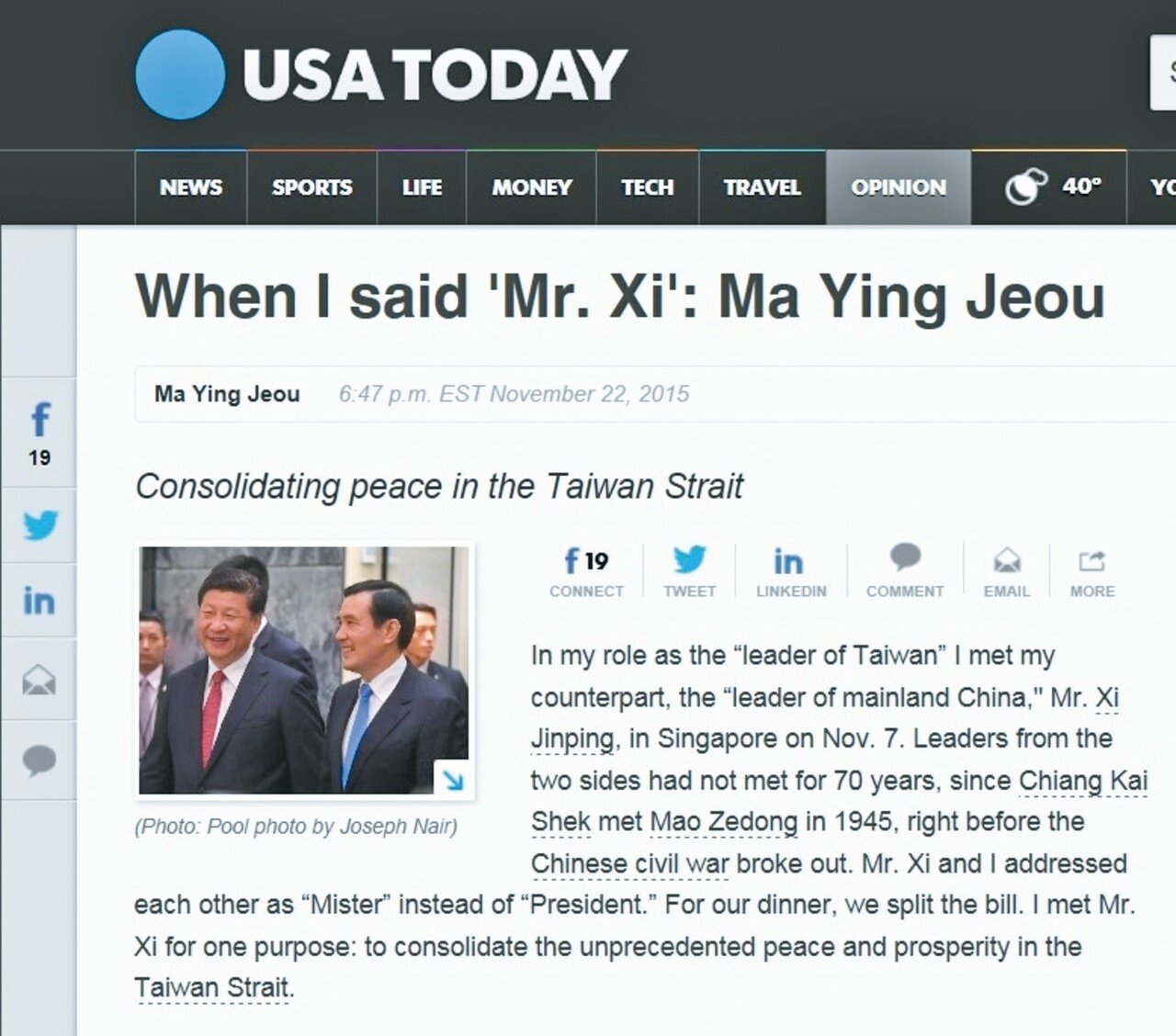 馬英九總統以中華民國總統身分,投書全美發行量最大的今日美國報(USA Today),刊登專文「當我稱呼習先生(When I said 'Mr. Xi')」。他表示,馬習會是雙方領導人首次正式公開為九二共識背書。無論誰繼任總統,只要堅持九二共識所打造的基礎,必能維持台海和平與繁榮的現狀。