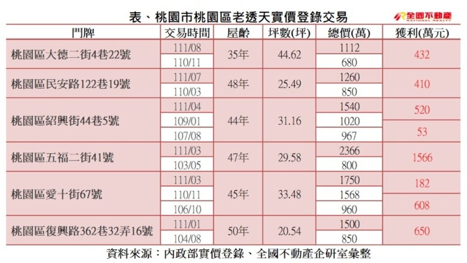 全國不動產總經理藍怡婷指出,桃園區五福二街屋齡47年的老透天,屋主在103年以800萬元進場,今年3月轉手房價來到2366萬元,8年獲利1566萬元,相當驚人;至於短線交易,大德二街今年8月出現持有9個月,總價從680萬翻揚至1112萬的35年透天,獲利432萬;民安路則在今年7月出現持有1年4個月,總價從850萬漲至1260萬元的48年老透天,增值410萬元。