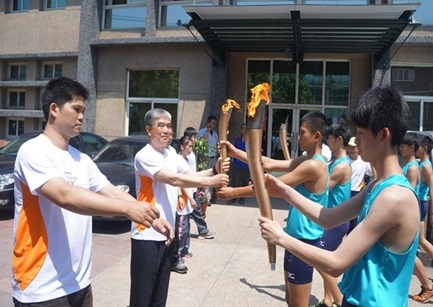 103年全中運聖火傳遞到楊梅,市長彭聖富親自率領公所團隊與瑞原國中學生迎接聖火,並進行聖火路跑傳遞。﹝記者吳世傑攝﹞