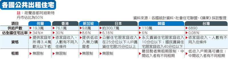 社會住宅推動聯盟指出,歐洲荷蘭的社會住宅佔全國總量約34%,日本、韓國約6%,新加坡8.6%,香港30%,但台灣出租宅僅佔0.08%,相較於其他國家,非常低。