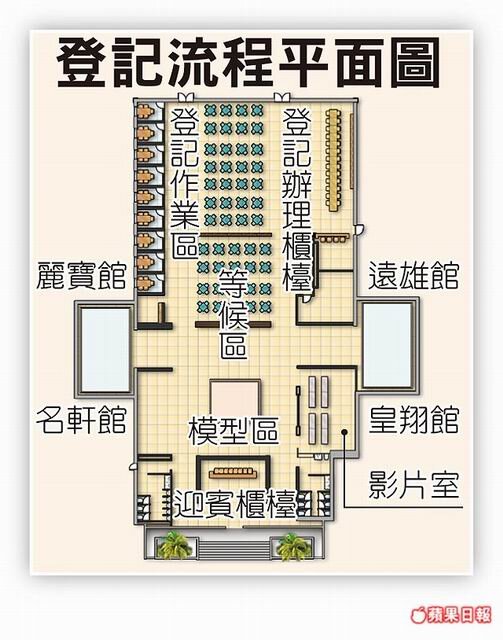 A7合宜住宅聯合銷售中心佔地1500坪,耗資1.8億元打造,共有逾150位接待人員,名軒、麗寶共享1個專區、遠雄、皇翔各1個專區,另配有休憩區、等待區及登記區,登記區共有15個接待櫃檯服務。
