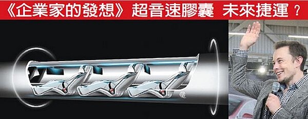 《企業家的發想》超音速膠囊 未來捷運? 特斯拉汽車創辦人與執行長馬斯克發表「高速圈」快速運輸系統的設計文件,表示有意建造這種未來運輸方式的雛型。「高速圈」的示意圖中,一條管子運輸坐在膠囊艙裡的乘客,最快速度每小時1220公里。(美聯社)