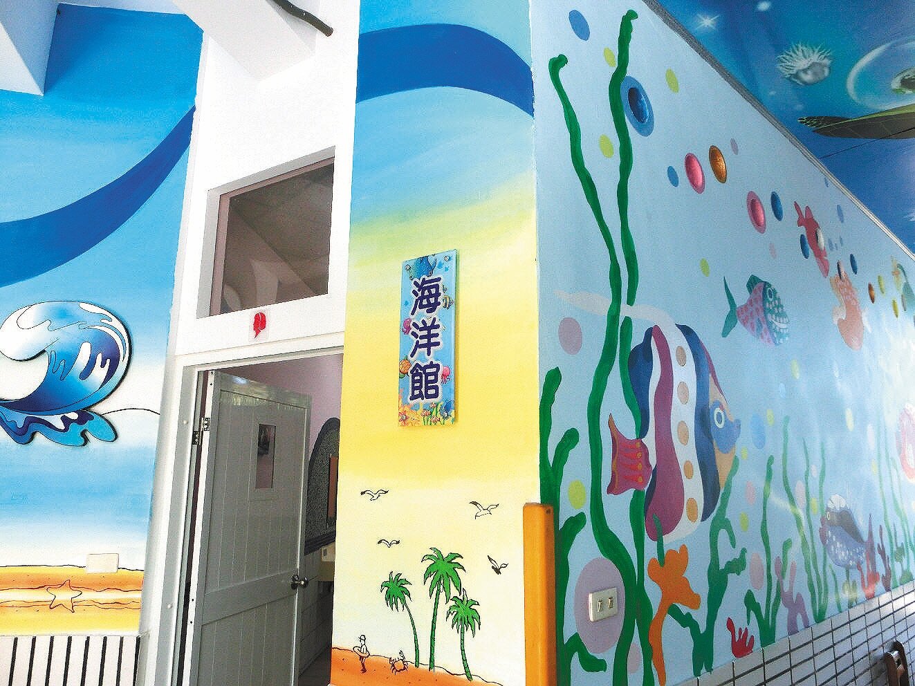 校方重視環境教育,於是從學生每天使用率高的廁所著手彩繪,打造花卉、蝴蝶、蜻蜓、青蛙、海洋、大樹及太陽館等主題廁所,昨天老師在海洋館外的海底隧道說繪本故事,講述海洋生物。
