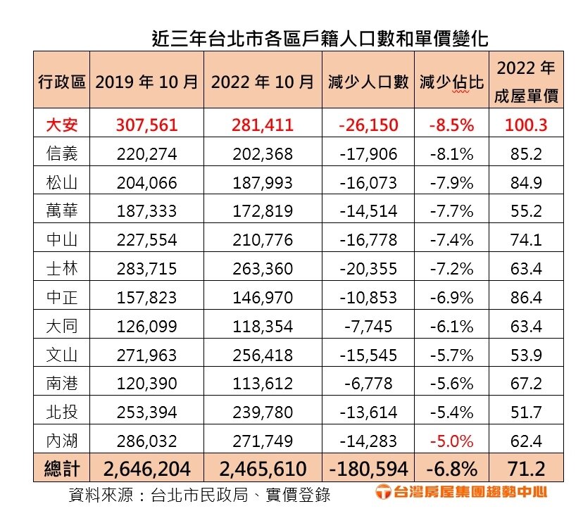台灣房屋統計台北市民政局各區戶籍人口數量,發現當前台北市的戶籍人口和2019年同期相比,3年間減少了18萬人,減幅達6.5%,又以大安區人口流失最多,從2019年10月的30.7萬人,減至28.1萬人,足足少了2.6萬人,減幅為8.5%,居台北各區之最;其次的信義區,近3年人口也減少了8.1%,流失人口達1.7萬人。