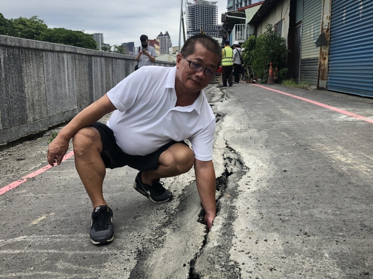 灣興里長張文青說,過去當地是易淹水區,1年多前排水整治工程和抽水站完工後,淹水問題有改善,卻出現地層下陷隱憂。上周大雨過後出現小裂痕,當時通報水利局,有緊急修補,近日裂痕加大,連寶珠溝的牆壁下都有明顯落差。