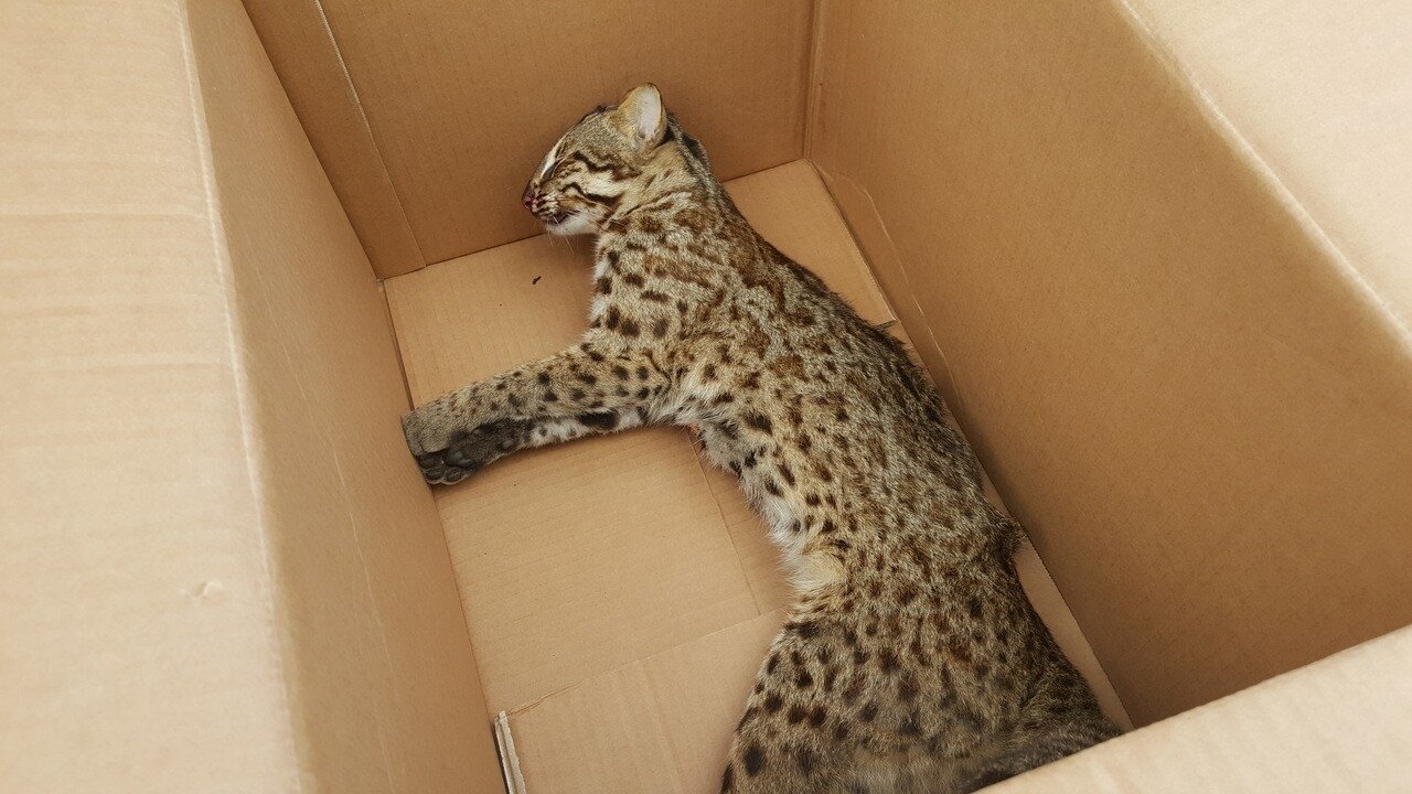 今天凌晨12點多,有民眾在後龍溪畔苗29線道路家禽屠宰場附近路段,發現有一隻石虎遭路殺,通報石虎保育團體,縣府自然生態保育科上午將石虎屍體送往後龍動物醫院檢驗,了解牠的狀況。