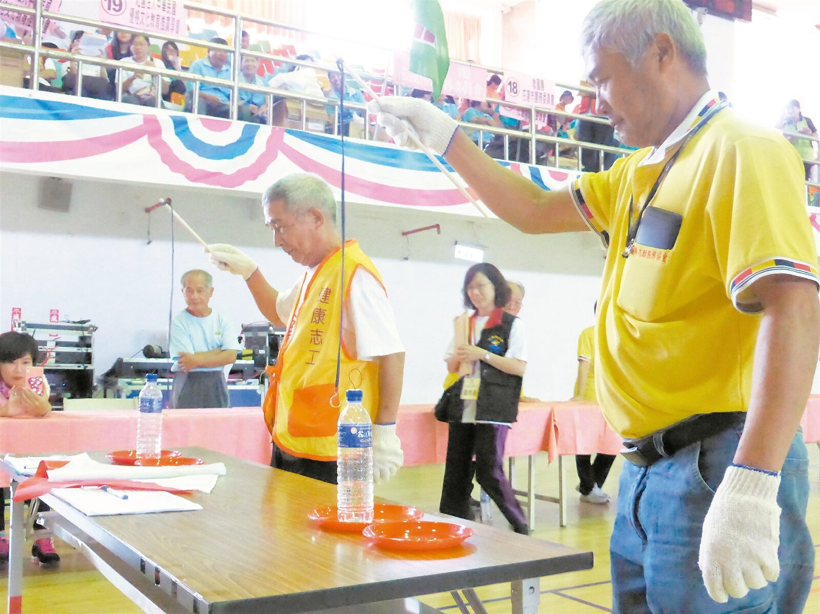 「『穿針引線』要眼力好的人啦!」趣味競賽開場,20支參加活動的志工團隊精銳盡出,但在彼此競爭的壓力下,參賽志工相當緊張,像「姜太公釣魚」的遊戲,要以帶著鐵鉤的釣竿鉤起裝水的小寶特瓶,但釣繩會因志工的手抖動而晃動,或隨風飄動,不太好控制。