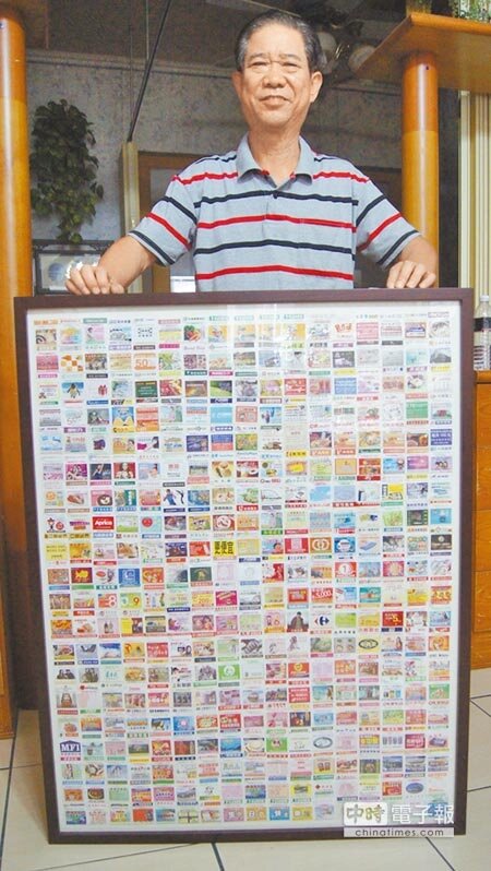 此外,他還收集末4碼從0001到1000的發票,分成有廣告板和無廣告板分別裝訂成冊,另將數百張印有廣告圖案的發票表框,依生肖、數字等分類排列,每次看著自己的戰利品,都覺得格外有成就感。