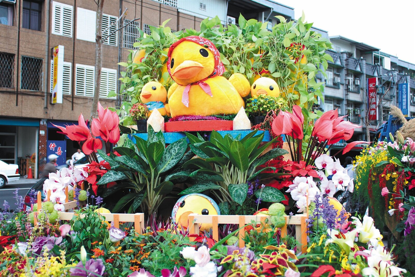 吉安鄉客家文化藝術節,黃色小鴨布偶頭上戴著客家花布,模樣逗趣。(記者陳家倫/攝影)