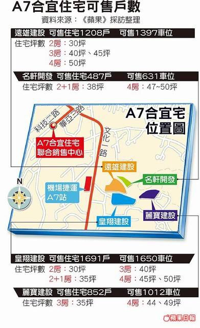 A7合宜宅可售戶數達4238戶,均價上限住宅每坪15萬元、陽台6.5萬元、車位100萬元,該案規劃樓層高價差,但每坪價差不超過1.2萬元,依樓層視野等條件,最貴16.2萬元,最便宜13.8萬元,總價450~800萬元。