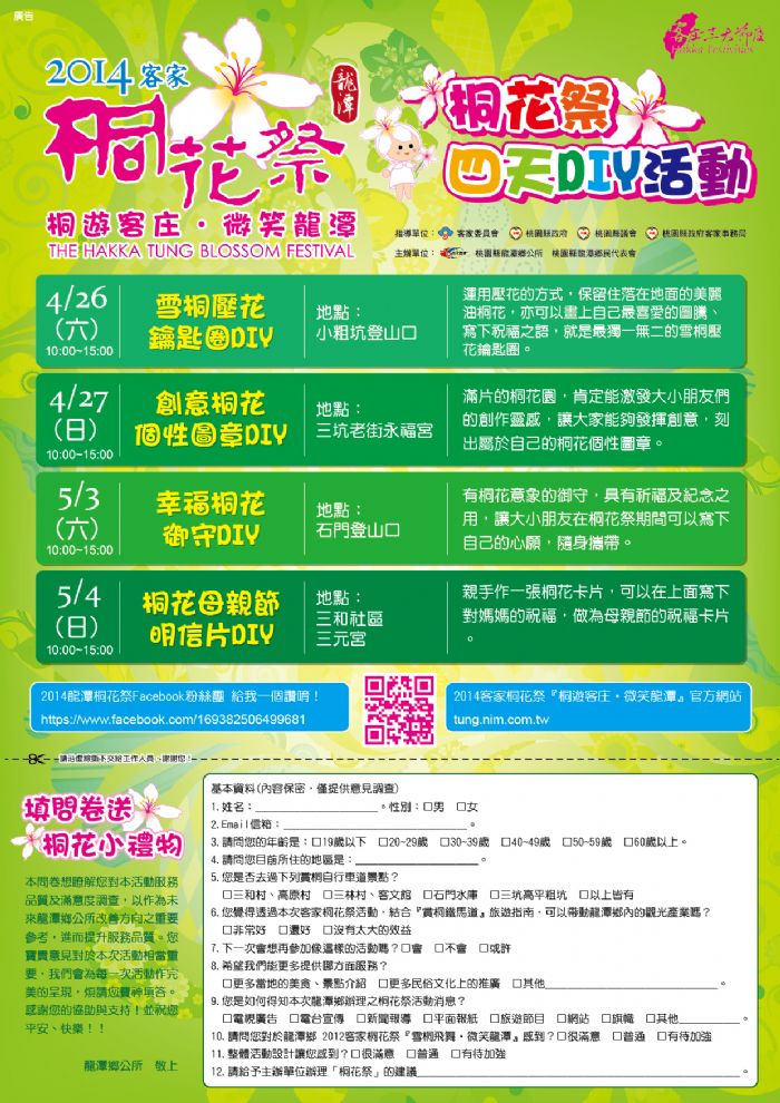 龍潭鄉公所特別規劃4場假日桐花文創商品DIY活動,可以讓民眾撿花瓣親手做出屬於自的的桐花文創商品,藉由「自己動手做」讓遊客發現客家之美。
