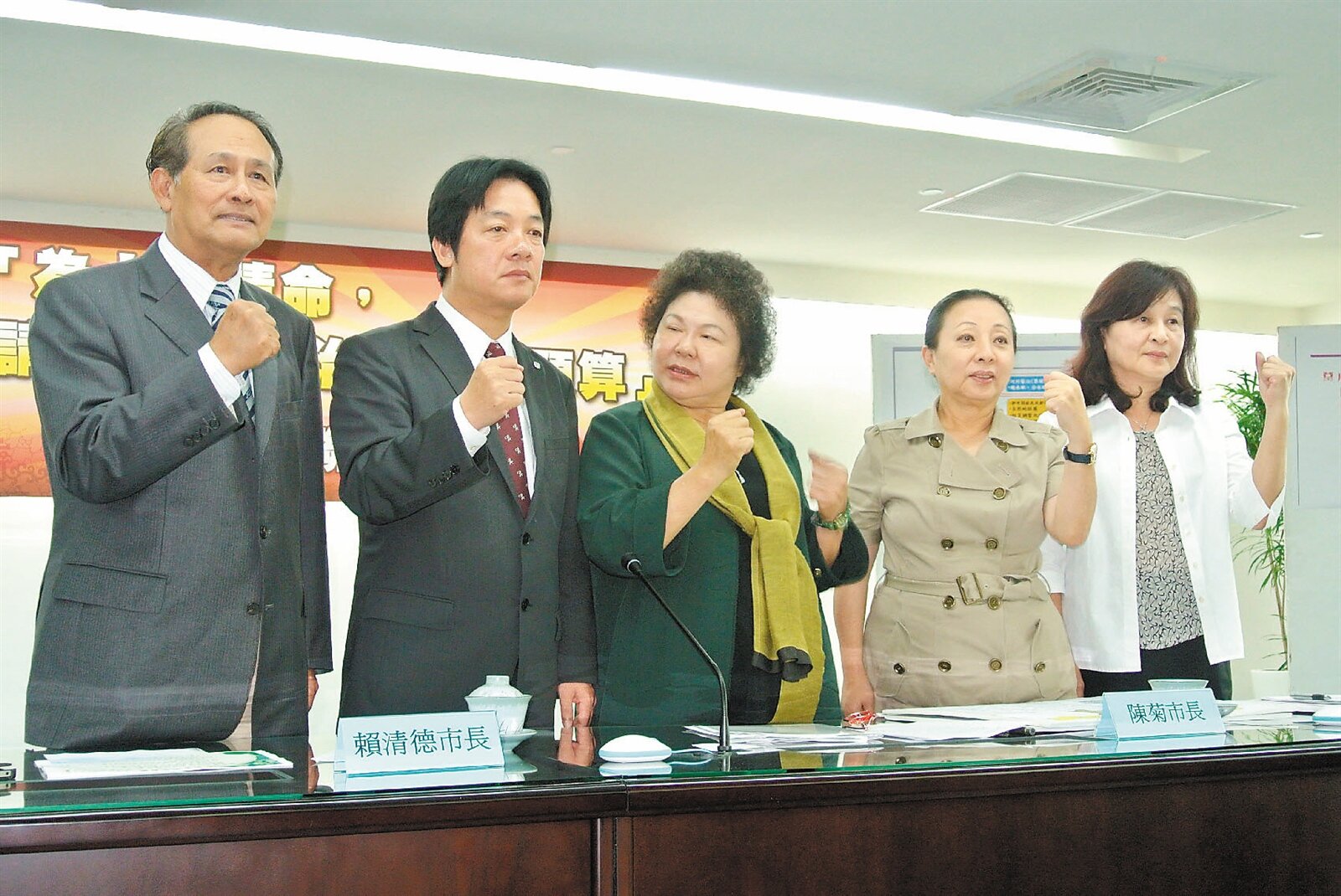 南部綠營五首長,上午齊聚台南,向中央爭取6年600億元治水預算,左起屏東縣長曹啟鴻、台南市長賴清德、高雄市長陳菊、嘉義縣長張花冠及雲林縣長蘇治芬。 (記者修瑞瑩/攝影)