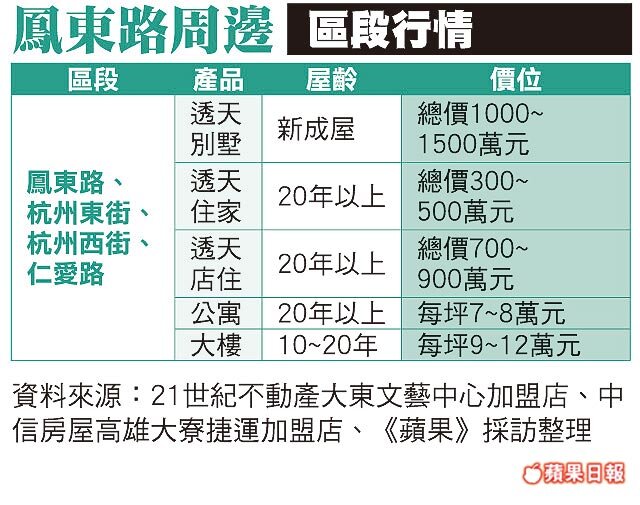 少數中古大樓則分布在鄰近陸軍官校一帶,屋齡10~20年,每坪9~12萬元,較去年同期上漲約2~3成。鳳東路周邊新案,臨鳳東路規劃6戶別墅,面寬皆為4米,2樓規劃整層主臥,主臥衛浴配備免治馬桶,總價1138萬元起。