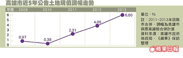 公告現值與公告地價是課徵土地增值稅與地價稅的基準,高雄市今年分別調漲6%與9.47%。