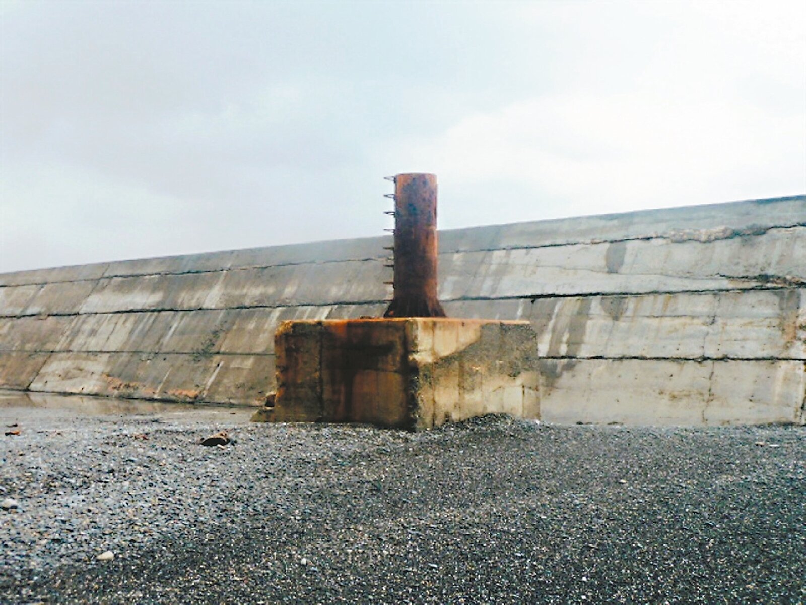 不堪風浪拍打的燈塔,被發現時已折斷。(記者潘俊偉攝影)