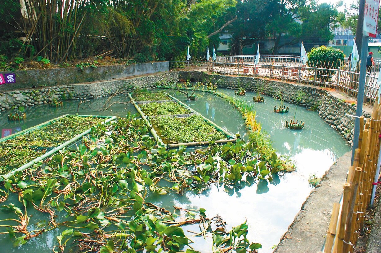帶領社區成員的大茅埔水草生態教育研究中心「田中博士」吳聲昱表示,水質淨化園區採用漂浮工法,共有50多種水生植物在陂塘內,經過一層一層的過濾、攔截,就可以淨化汙水。